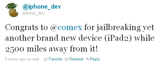 Разработчик программного обеспечения для устройств на базе Apple iOS и по совместительству известный в хакерских кругах специалист comex сообщил об успешном джейлбрейке только что вышедшего планшета Apple iPad 2. В доказательство своих слов comex опубликовал фото- и видеоматериал. На фото без труда угадывается запущенный на взломанном гаджете магазин приложений Cydia. При этом планшет работает под управлением свежей версии операционной системы за номером 4.3.