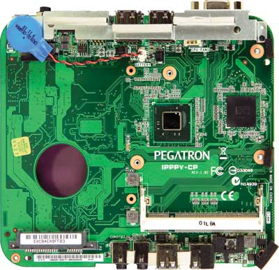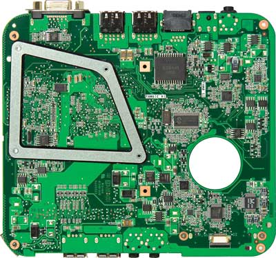 Если открыть корпус устройства и снять систему охлаждения, то на миниатюрной системной плате устройства, размеры которой всего 170x140 мм, выделяются две микросхемы: процессор Intel Atom и чипсет Intel NM10 Express.