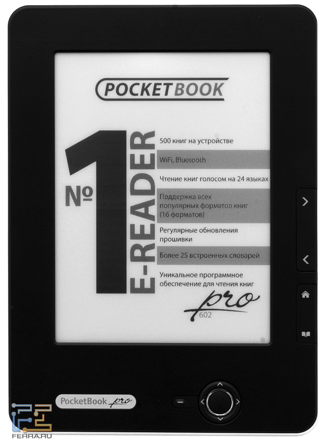 Внешностью PocketBook Pro 602 заметно отличается от предыдущих моделей. Выглядит ридер современно, не «по-китайски». И, несмотря на то, что экран устройства не сенсорный, аппарат всё равно не перегружен кнопками.