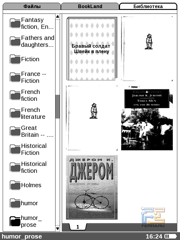 Доступно два представления хранилища книг: в виде папок с файлами и в виде библиотеки с книгами, сгруппированными по жанрам и по форматам. Второе — приятное нововведение, прежние ридеры PocketBook умели работать только с файлами как таковыми.