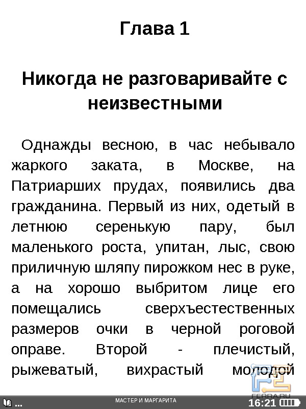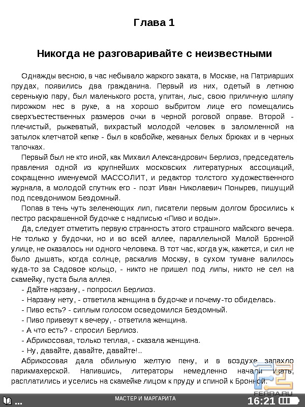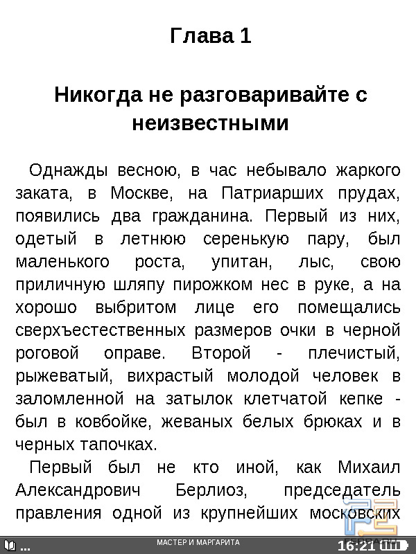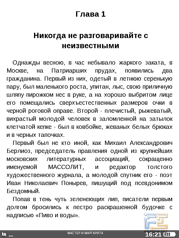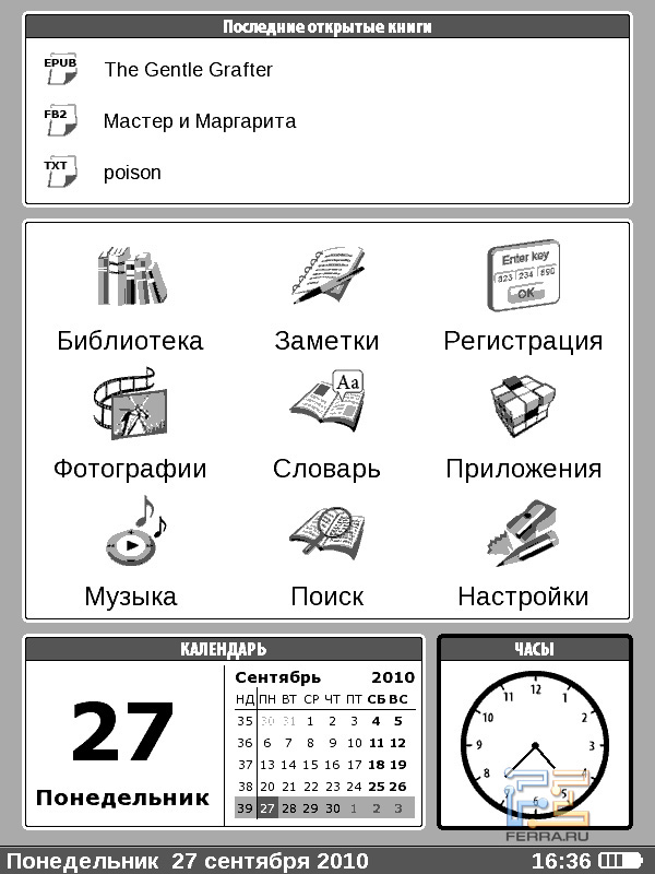 Теперь перейдём к собственно чтению. Книги открываются быстро, за пару секунд, это время слабо зависит от объёма произведения и формата. Кнопкой навипада можно регулировать масштаб — доступно пять вариантов размера букв. При чтении книг в PDF и DejaVu страницы просто увеличиваются и не помещаются целиком на экране — издержки особенностей форматов. В меню настроек можно выбрать гарнитуру, междустрочный интервал, а также включить или отключить расстановку переносов. Для книг в форматах, предусматривающих структурирование текста, ридер может вывести оглавление. Разумеется, поддерживаются закладки и пользовательские заметки. Страницы книг перелистываются почти мгновенно — и это, увы, единственное, что ридер делает быстро.